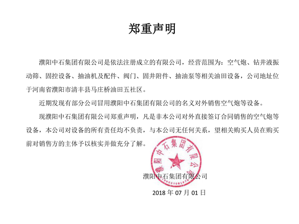 濮陽中石集團有限公司屬中原油田規范型改制企業,專注制造空氣炮30年的實力廠家。本集團以生產制造石油機械裝備為主,兼營國內外貿易的綜合企業。主要產品有:空氣炮、壓力容器制造、固控設備、環保設備、采油設備、電氣設備、油氣脫硫裝置以及鋼結構和野營房生產加工等10大類100多項。集團產品除銷往國內各大油田外,已出口到中東、中亞、南美及非洲等10多個國家和地區。